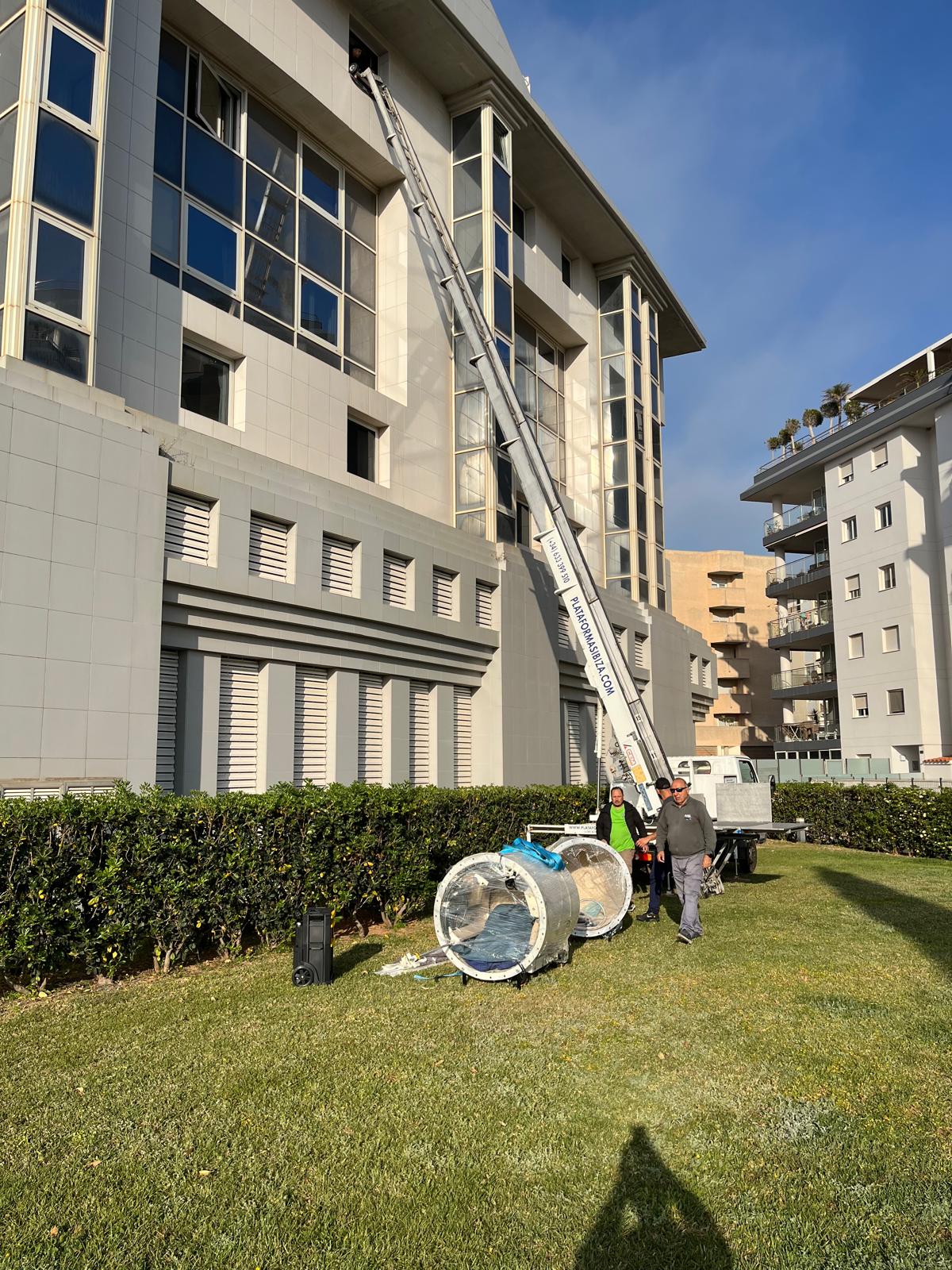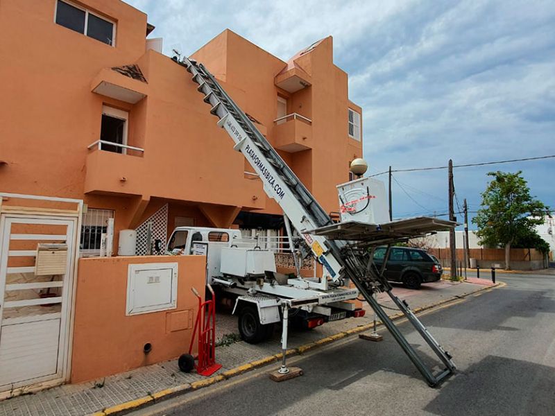 Trabajamos en todos los municipios de la isla: en este caso utilizamos nuestra plataforma elevadora en el de Eivissa, alquilable por horas (mínimo 3).