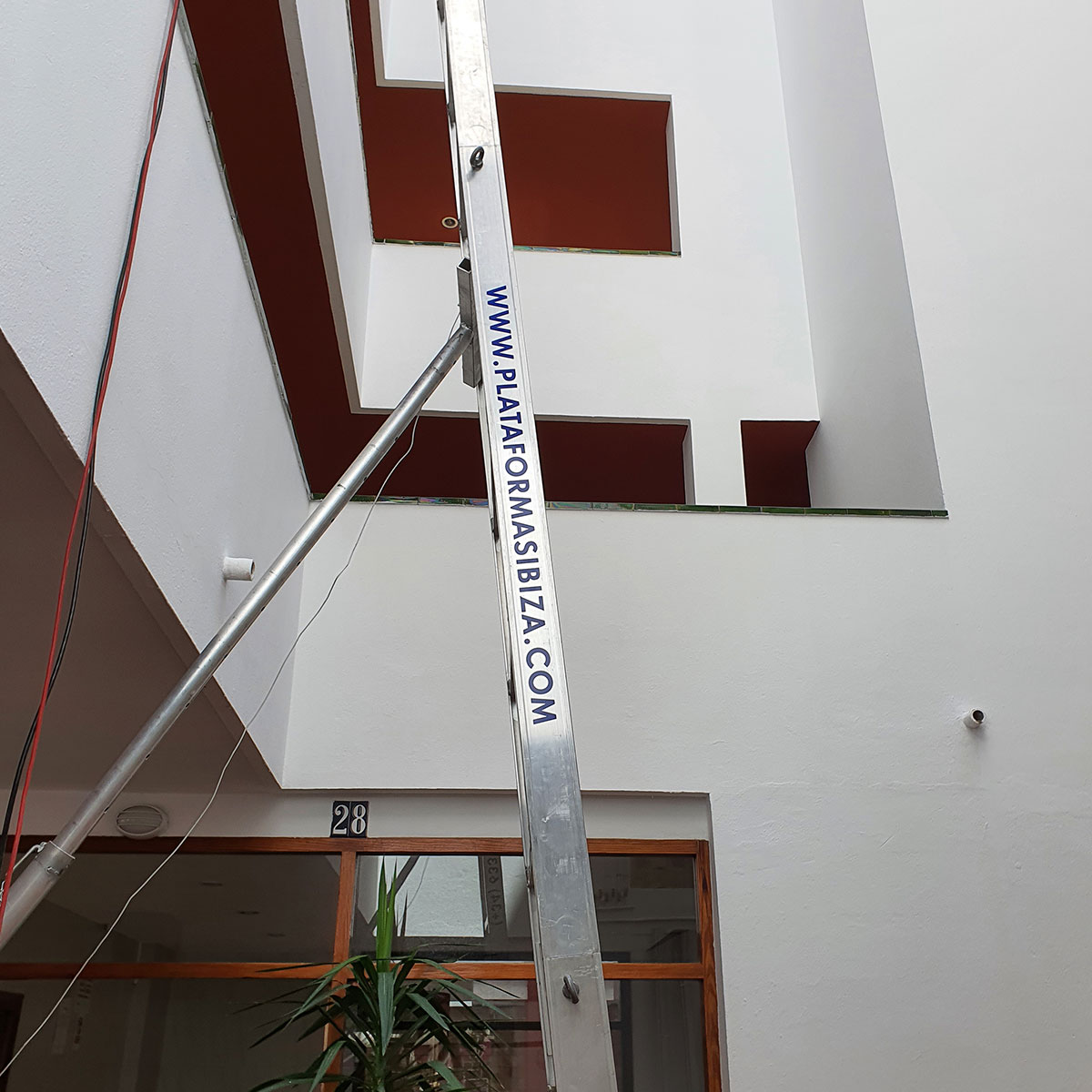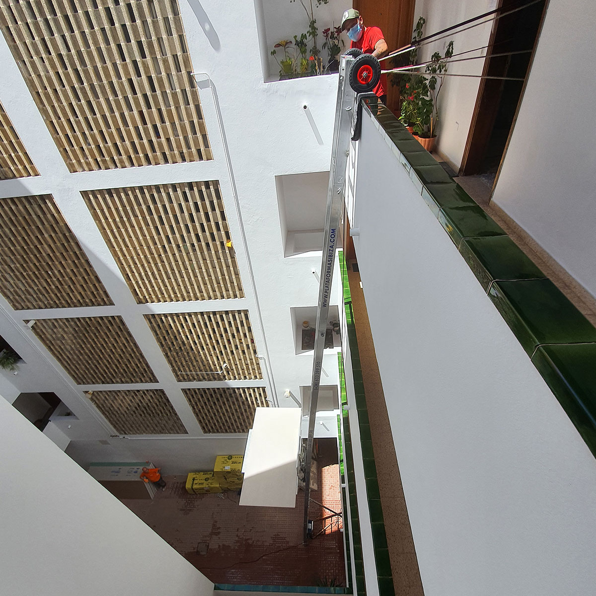 En este trabajo utilizamos nuestra plataforma elevadora para transportar placas de pladur y cristalería a un cuarto piso en Ibiza.